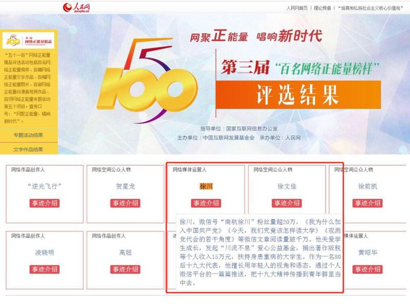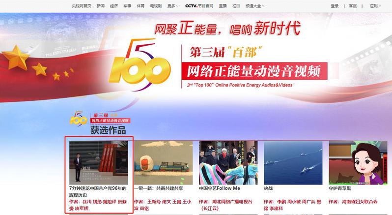 11月21日,由国家互联网信息办公室指导,中国互联网发展基金会主办,人民网、央视网、中国青年网、中国新闻网、环球网共同承办的第三届“五个一百”网络正能量精品评选活动结果揭晓,我院教师徐川获评全国“百名网络正能量榜样”。这也是继2016、2017后,徐川连续第三年获此殊荣。与此同时,由我校和新华社共同制作的视频作品《7分钟速览中国共产党96年的辉煌历史》获评全国“百部网络正能量榜样音视频”。