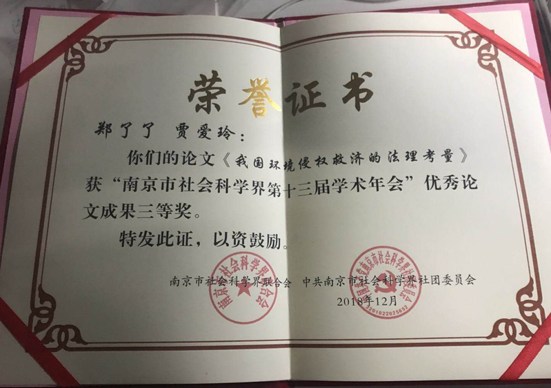 12月19日,2018年南京市哲学社会科学界第十三届学术年会在南京召开,本届年会的主题为“建设创新名城,实现高质量发展”。江苏省社科联党组书记、常务副主席刘德海出席会议并作主旨演讲。市社科类社会团体、区社科联、高校社科联负责人及获奖论文作者代表150余人参加会议。会上对学术年会优秀论文成果和作者进行表彰。本届学术年会共收到征文200余篇,经编委会最终评审,42篇论文获奖并入选核心期刊《南京社会科学》专刊,其中一等奖4篇,二等奖14篇,三等奖24篇。我院博士生郑了了撰写的《我国环境侵权救济的法理考量》喜获三等奖。