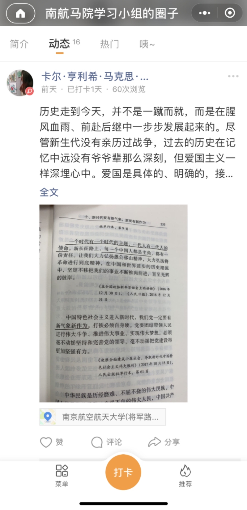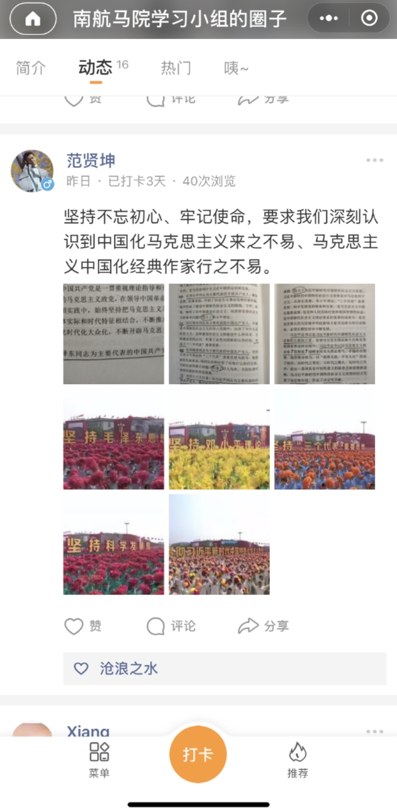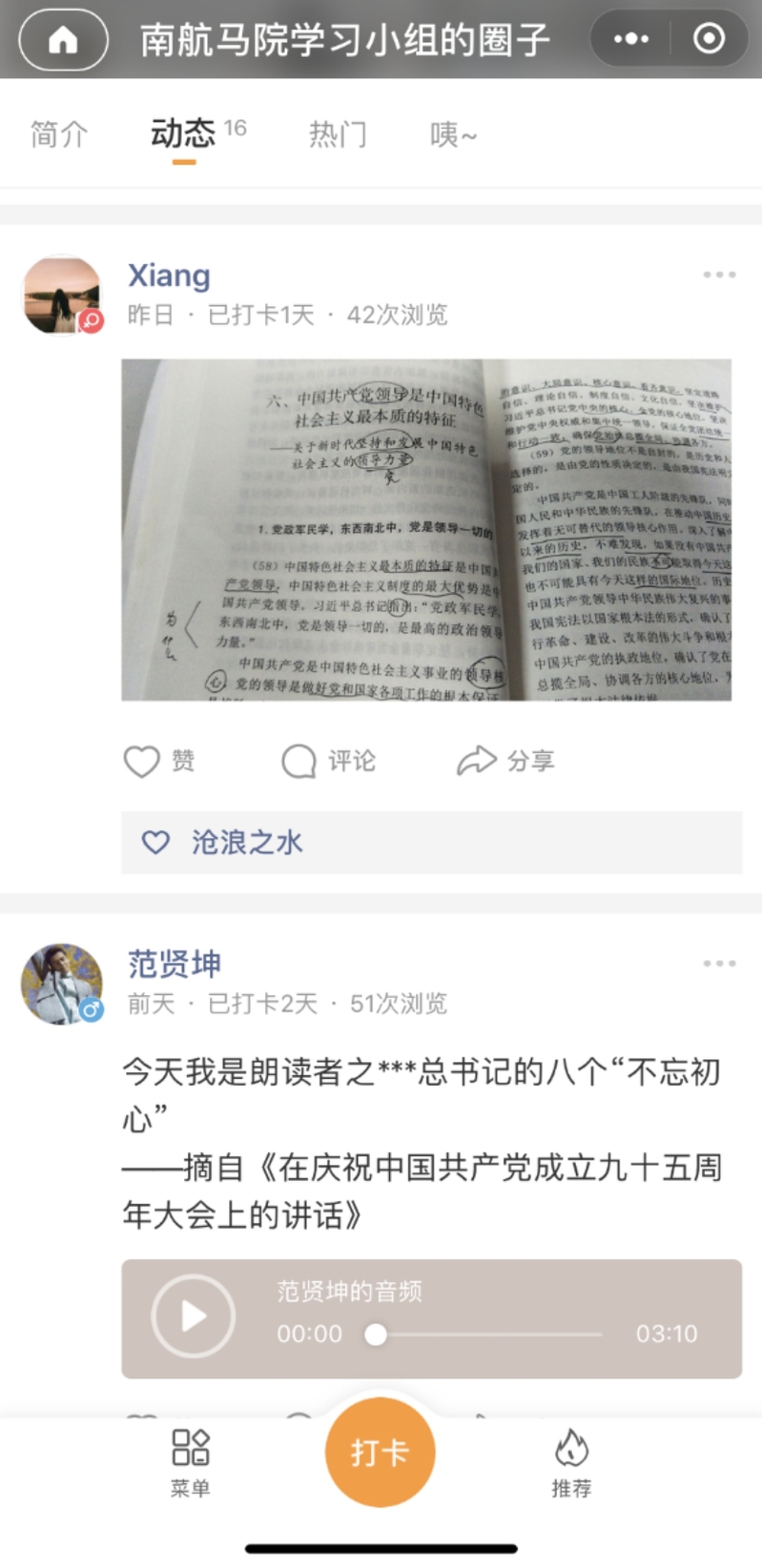 在主题教育中,亚洲午夜国产剧场把学生党支部的学习教育摆在突出位置,深入研究新形势下学生党员思政工作的规律和特点,把主题教育和新技术新手段结合起来,运用微信小程序建立“南航马院学习小组”,引导学生党员和积极分子主动学习“打卡”,在专区分享个人学习语音、文字、图片和感悟。同时借鉴互联网社区管理方法,采用每周每月排名奖励的方式,在专区融入用户成长体系,形成了比学赶超的良好氛围,让学习教育有趣有效。此外,马院学生党支部还通过领航学堂学习、观看《周末理论大讲堂》在线课程、“读原著学原文悟原理”系列活动等途径,让主题教育更有“理论味”“信仰味”。