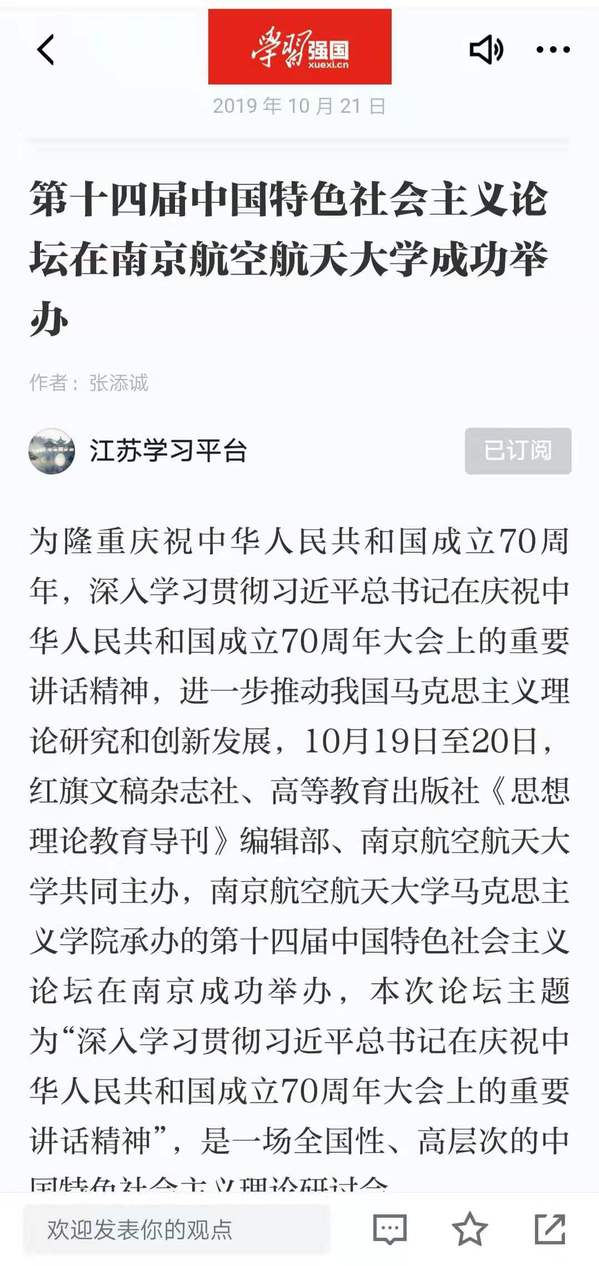10月21日,“学习强国”平台报道了由红旗文稿杂志社、高等教育出版社《思想理论教育导刊》编辑部、南京航空航天大学共同主办的第十四届中国特色社会主义论坛。现转发全文: