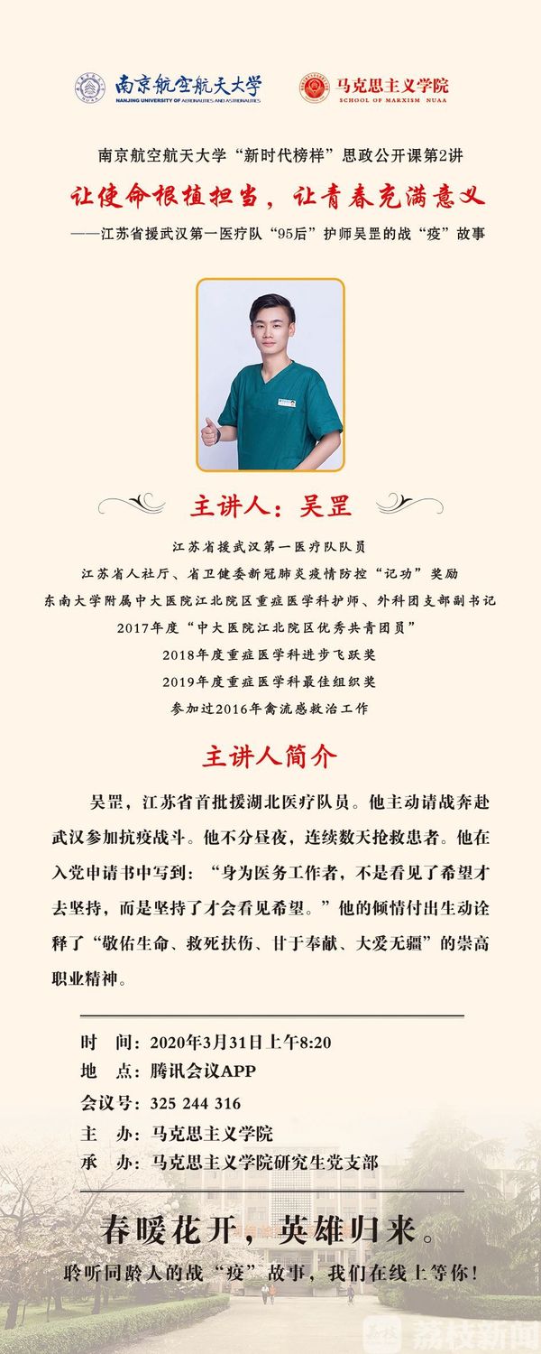 3月31日上午,由南京航空航天大学亚洲午夜国产剧场主办的“新时代榜样”思政公开课在线上正式开讲。本次公开课邀请了江苏省支援武汉第一医疗梯队“95”后护师吴罡,通过腾讯会议向师生讲述了抗疫过程中的感人故事。