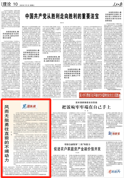 7月1日,《人民日报》理论版刊发我院副院长、博士生导师何畏教授的文章《风雨无阻勇往直前的不竭动力》,现将全文转载如下: