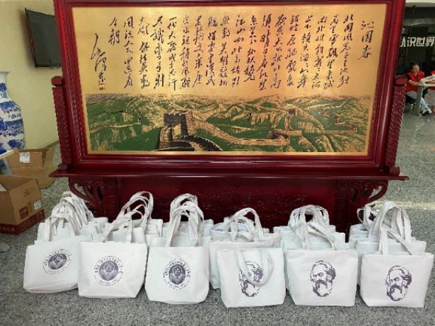 在迎新氛围营造和入学纪念品的设计中,学院精心设计,将思政教育元素融入其中。欢迎展板上展示了马恩经典著作语录,在小收纳纸盒盒面分别印制了习近平总书记关于学习修身勤俭节约身心健康等方面的论述,对应给学生赠送了《习近平新时代中国特色社会主义思想三十讲》书籍U盘小零食、口罩、净手凝胶、特色帆布袋等纪念品,发放了“节约粮食、光盘行动”倡议书