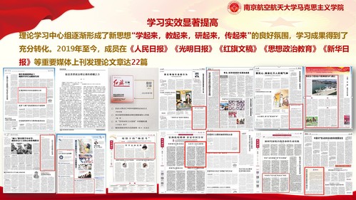 2019年以来,学院与航空学院、新华日报等多家单位进行联合学习,深入校内外宣讲40余场,在权威媒体刊物发表学习成果文章22篇,逐渐形成了新思想“学起来,教起来,研起来,传起来”的良好氛围,学习成果得到了充分转化。