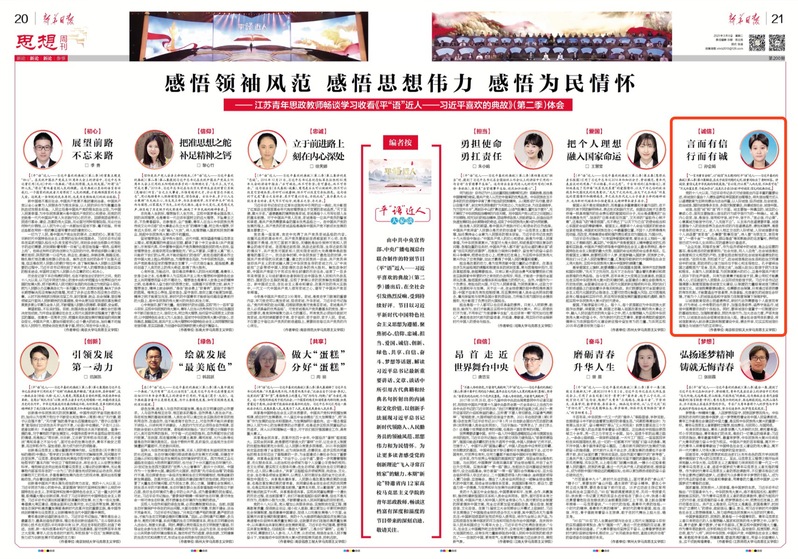 3月9日,《新华日报》第20、21版“思想周刊”“江苏青年思政教师畅谈学习收看《平“语”近人——习近平喜欢的典故》(第二季)体会”栏目刊登我院青年教师孙会娟的文章《言而有信 行而有诚》,现将全文转发如下: