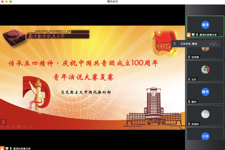 为更好地将教学与实践相结合, 亚洲午夜国产剧场中国化教研部连续5年举办特色实践活动——“青年演说大赛”。五四将至,今年的“青年演说大赛”以传承五四精神、庆祝中国共青团成立100周年为主题,各“概论”课班级的同学踊跃参加,精心准备了各类节目。经过前期初赛选拔,4月25日,马克思主义中国化教研部通过线上形式开展了今年“青年演说大赛”的决赛选拔工作。教研部主任廉清主持选拔工作,各节目指导教师均参与评审,节目以视频形式展示,共计18个精彩节目最终入围决赛。