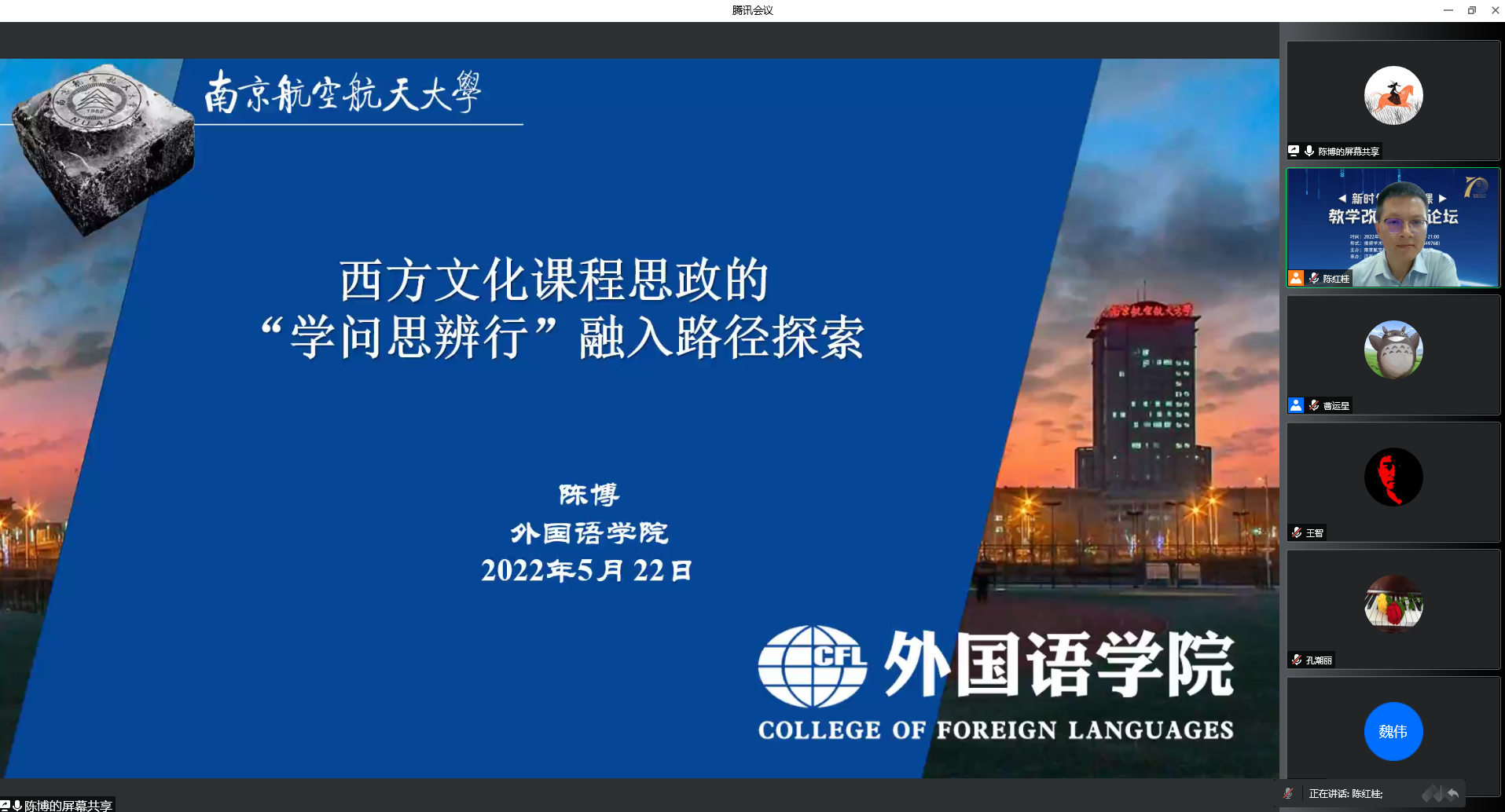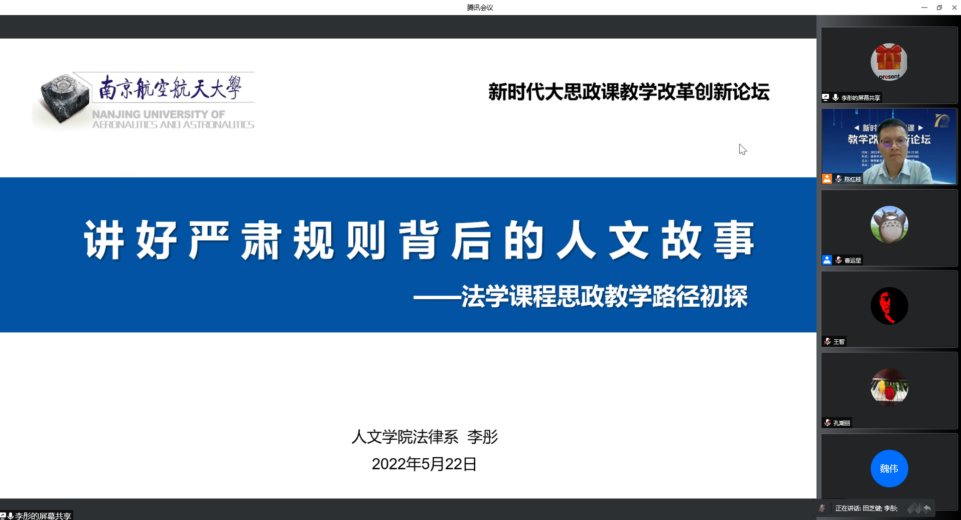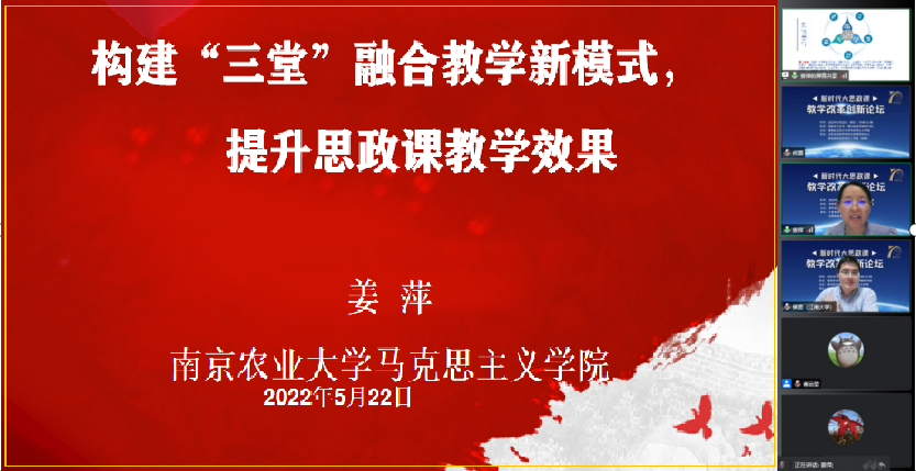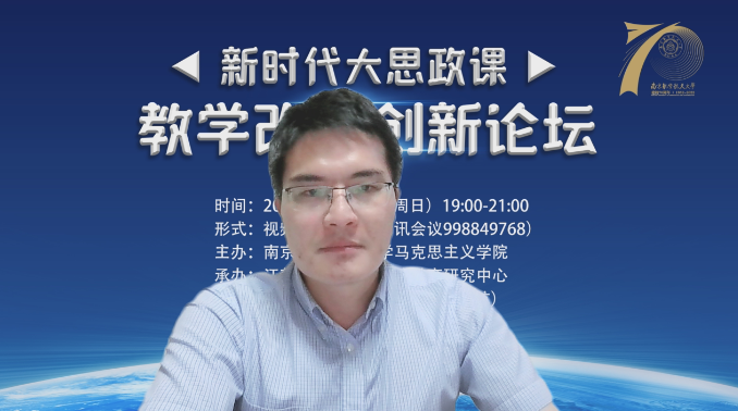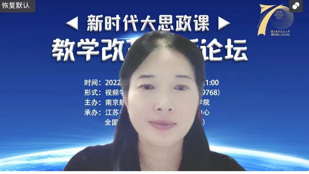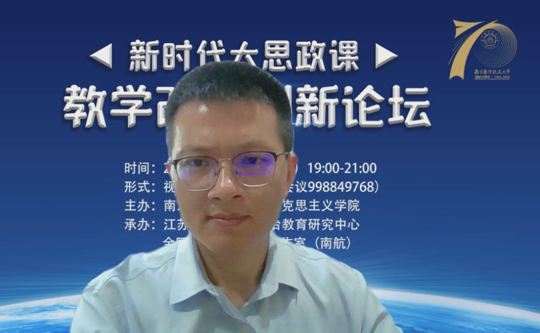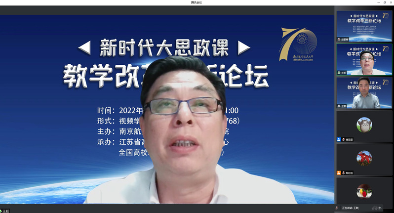2022年5月22日,由南京航空航天大学亚洲午夜国产剧场、江苏省高校思想政治教育研究中心、全国高校思政名师工作室(南航)主办的新时代大思政课教学改革创新论坛在我院召开。来自南京大学、南京师范大学、苏州大学、河海大学、南京农业大学、江南大学、南京艺术学院等多所高校的专家学者,以线上方式参加了本次论坛。