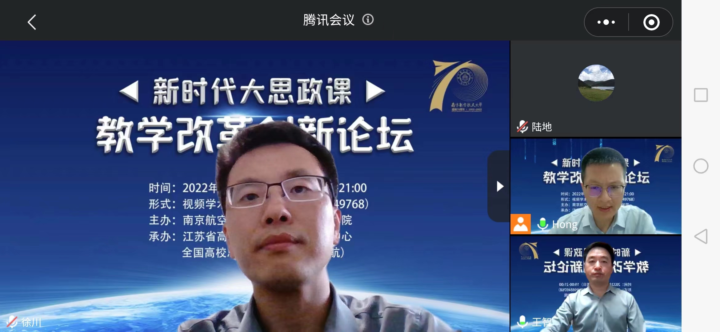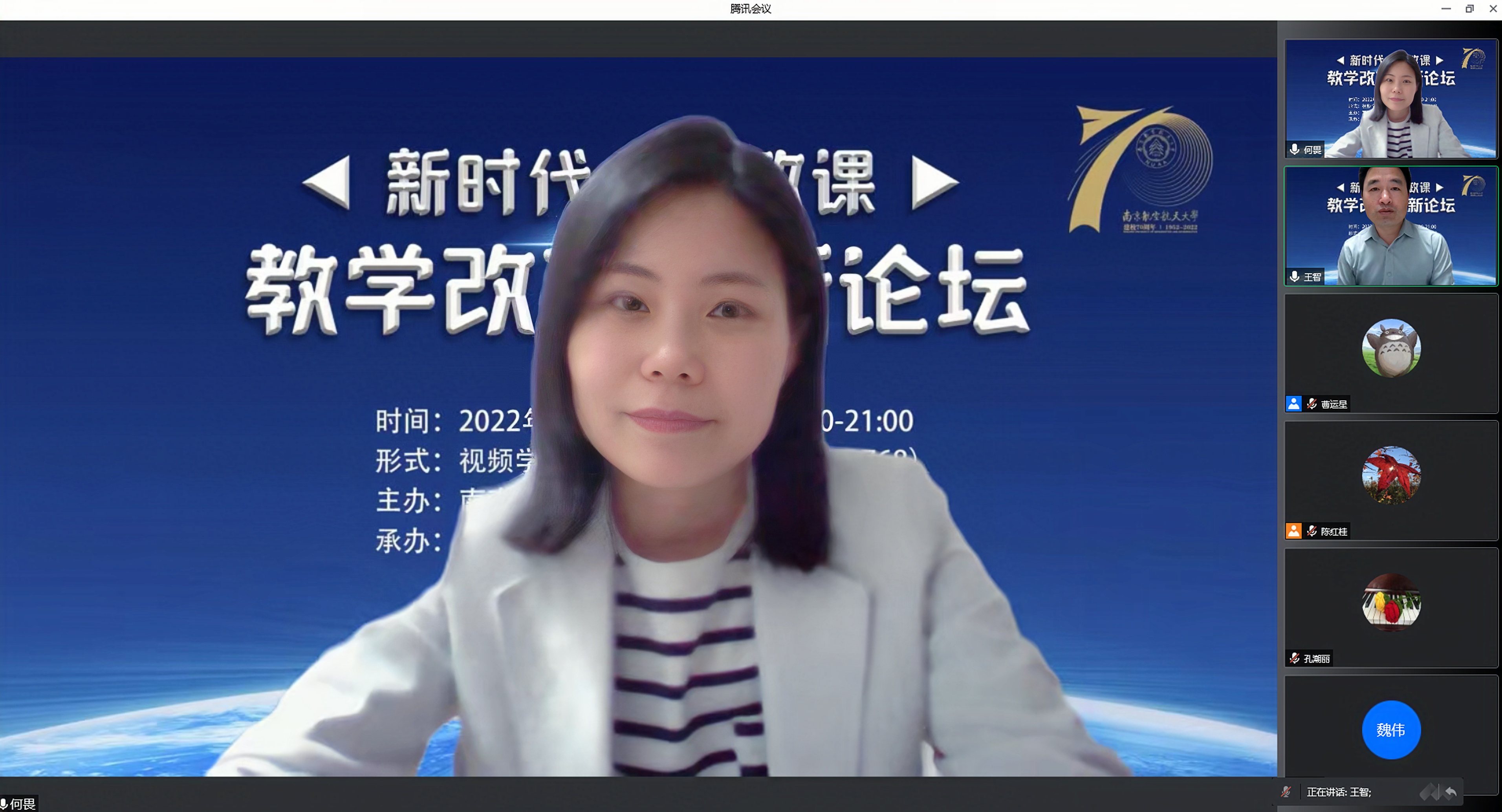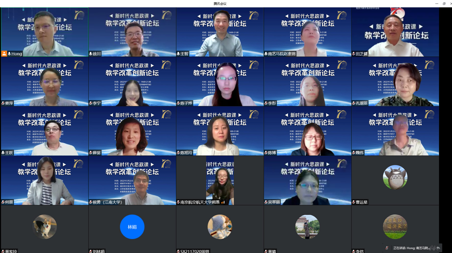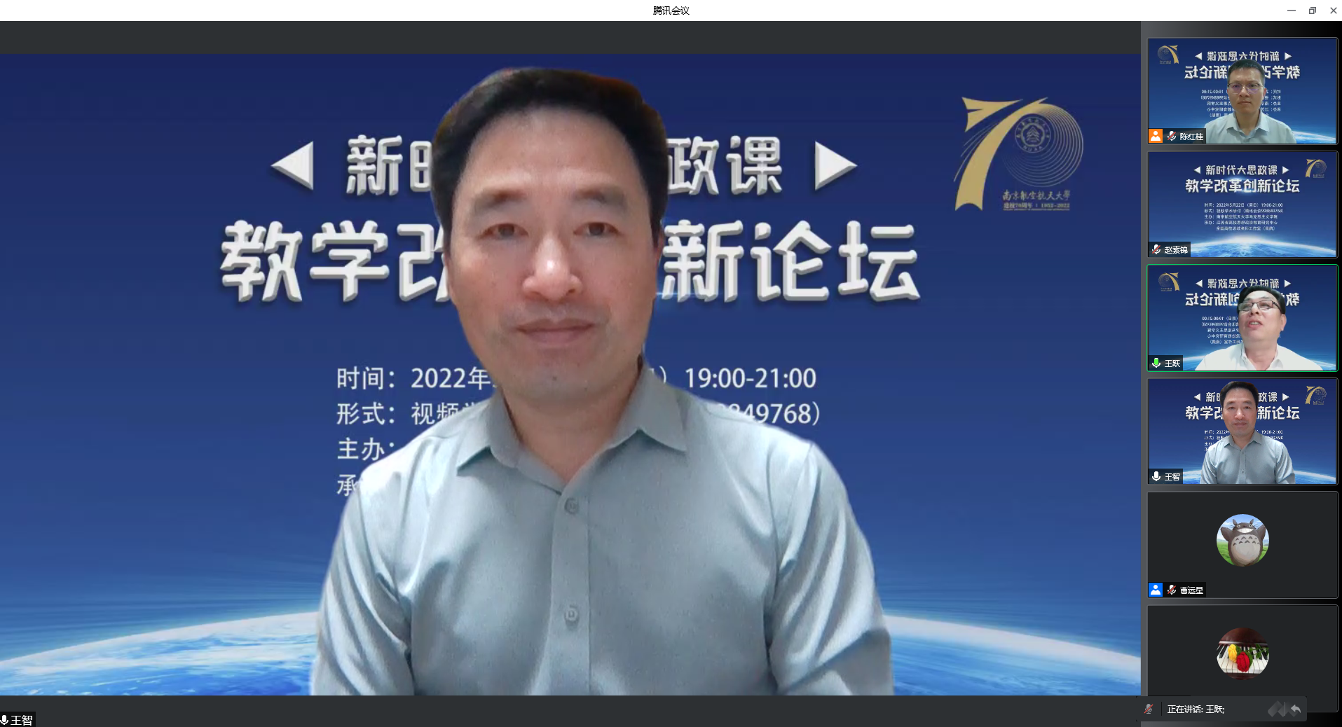 2022年5月22日,由南京航空航天大学亚洲午夜国产剧场、江苏省高校思想政治教育研究中心、全国高校思政名师工作室(南航)主办的新时代大思政课教学改革创新论坛在我院召开。来自南京大学、南京师范大学、苏州大学、河海大学、南京农业大学、江南大学、南京艺术学院等多所高校的专家学者,以线上方式参加了本次论坛。