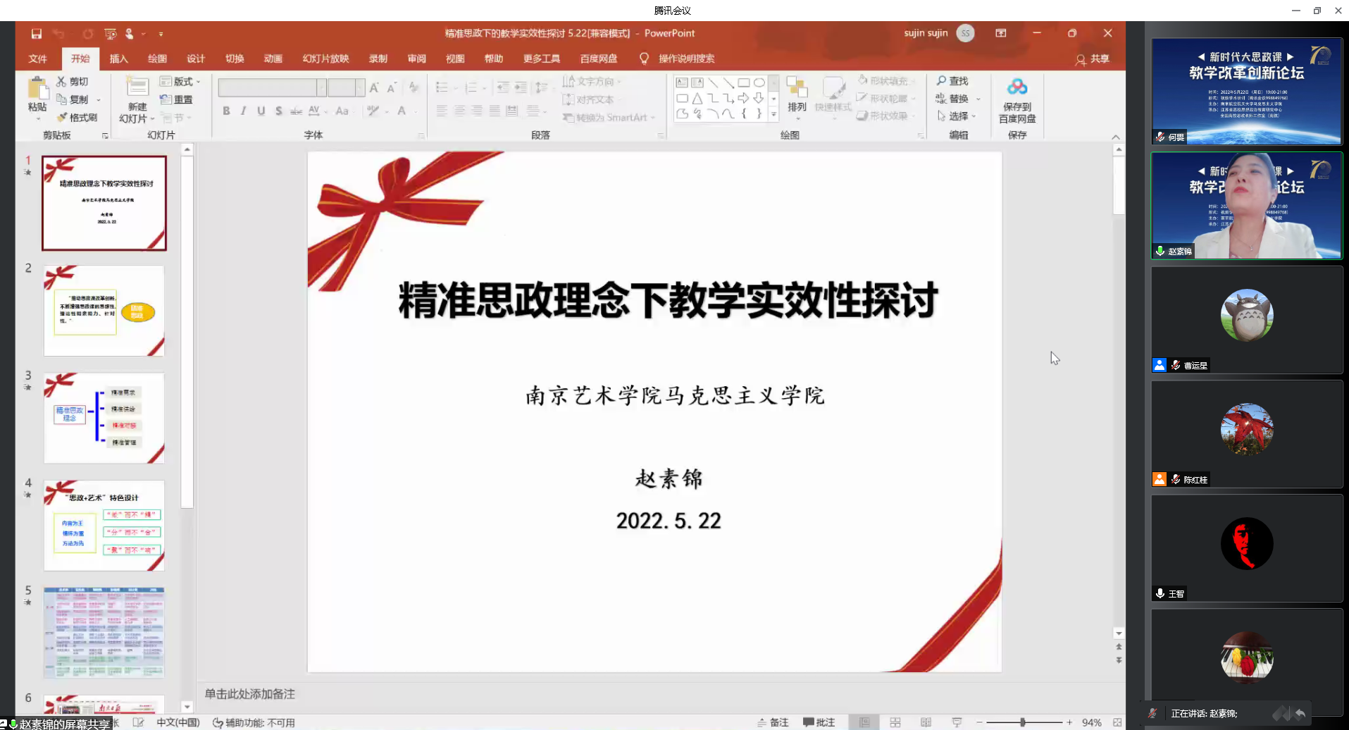 南京艺术学院亚洲午夜国产剧场赵素锦副院长就精准思政理念下提升教学实效性做了分享。她从研究精准需求、注重鲜明特色、情怀为重、方法为先、精准施策等角度阐释了对大思政课改革创新的理解。还介绍了南京艺术学院在精准思政方面的探索和经验做法。
