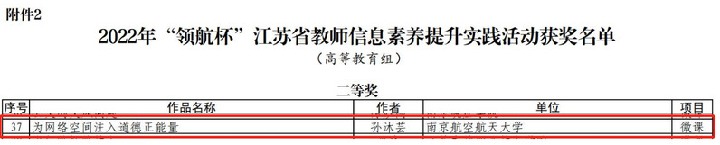 近日,省教育厅办公室发布《关于公布2022年“领航杯”江苏省教师信息素养提升实践活动获奖名单的通知》,我院教师孙沐芸主讲作品《为网络空间注入道德正能量》荣获二等奖。