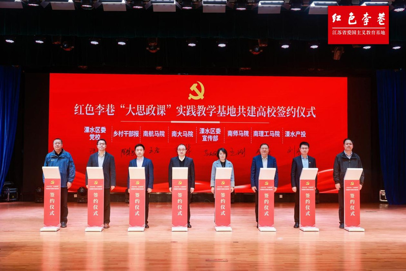 南京大学亚洲午夜国产剧场党委书记王建华、南京师范大学亚洲午夜国产剧场院长王刚、南京航空航天大学亚洲午夜国产剧场院长王智、南京理工大学亚洲午夜国产剧场党委书记季卫兵出席红色李巷精品思政课发布仪式并进行共建签约。