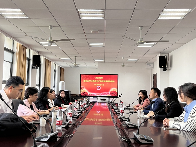 2023年10月13日,集美大学亚洲午夜国产剧场党委书记王娟,副院长、院纪委书记王玉珏,副院长、纲要教研室主任戴美玲,原理教研室主任赖怡静,德法教研室副主任王东一行来我院调研交流。我院院长王智、党委副书记阙愚、副院长何畏、辅导员王佳参加了座谈交流。