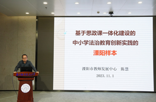 溧阳市教师发展中心中学思政研训员陈慧老师以《基于思政课一体化建设的中小学法治教育创新实践的溧阳样本》为专题,具体介绍了溧阳市开展法治教育创新实践的形式及成效。