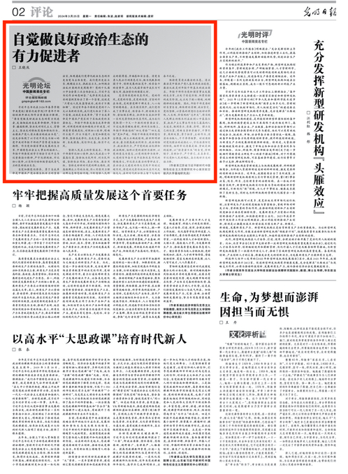 3月25日,《光明日报》第02版“光明论坛”栏目刊发了江苏省习近平新时代中国特色社会主义思想研究中心南京航空航天大学基地研究员王晓庆的理论文章《自觉做良好政治生态的有力促进者》,现将全文转发如下: