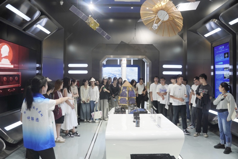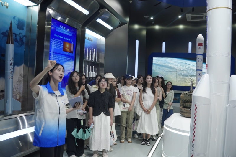 十点半,师生们来到航天馆,我院23级硕士研究生李媛媛担任讲解员,对馆内五个展区做了详细的介绍,使同学们深入了解我国航天事业的发展历程及我校在国家航天事业中的贡献,并对“两弹一星”精神、载人航天精神、探月精神等中国航天精神谱系的内核有了更深的感悟。