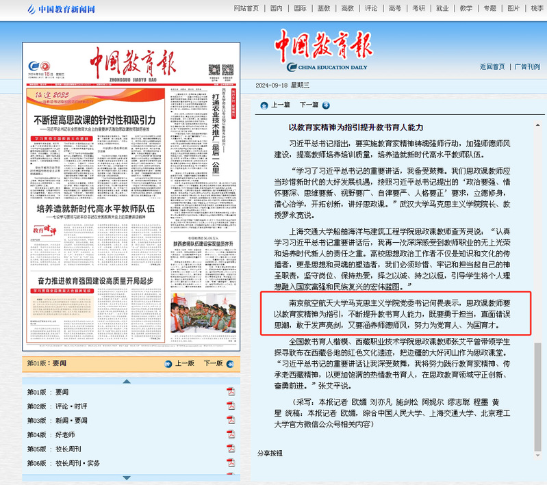 2024年9月18日,《中国教育报》刊发文章《不断提高思政课的针对性和吸引力——习近平总书记在全国教育大会上的重要讲话激励思政课教师踔厉奋发》,文中引述我院党委书记何畏关于学习习近平总书记在全国教育大会上的重要讲话和全国教育大会精神的心得体会。现将全文转发如下: