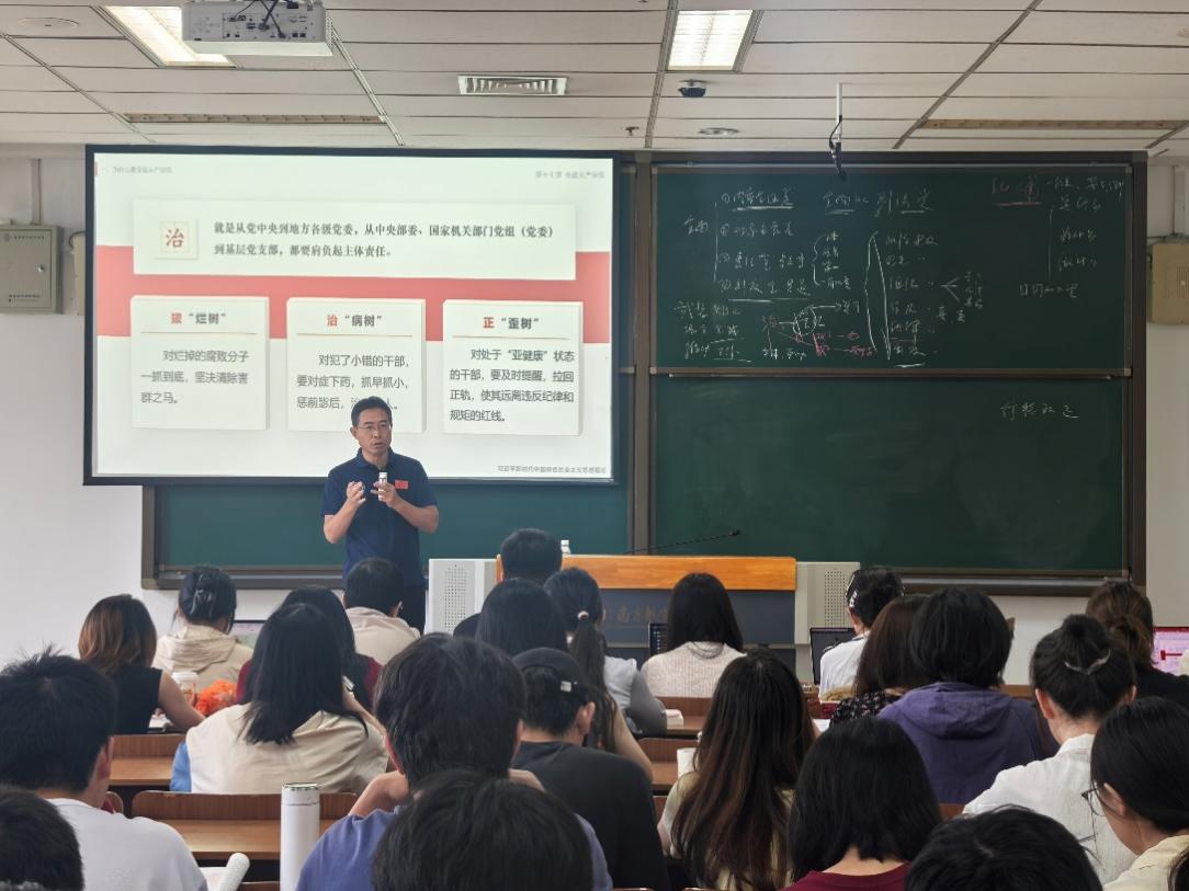 专题课上,杭育新从“全”“严”“治”三个方面深入解析了全面从严治党的历史背景、主要内容、重要意义和实践要求。课堂内容详实、案例生动,理论高度与实践深度并重,增进了师生对“全面从严治党”的理解与认识。